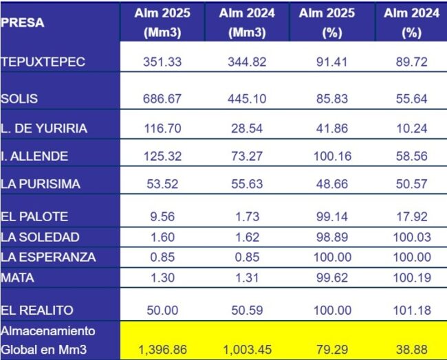 Now main dams of Guanajuato have an average storage percentage of 80 percent, registering 1,396.9 million cubic meters.