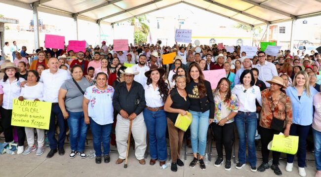 As part of the tour, in the La Estrella community, Libia Dennise led the start of work to pave Professor Medel Street and Emiliano Zapata Street as part of the “Beautifying My Neighborhood” program of the Secretary of the New Beginning, which includes 1,181 square meters of hydraulic concrete paving, curbs, sidewalks, and the renovation of water and drainage systems.