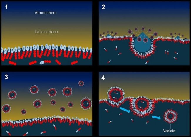 Over time, these vesicles could be dispersed through the lakes and seas, interacting and potentially leading to the creation of protocells.